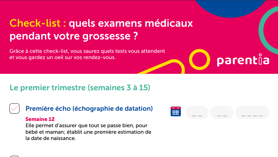 Sur la chronologie ci-dessous, vous trouverez un aperçu clair de tous les examens. Ou téléchargez notre checklist pratique « Examens medicaux pendant la grossesse », où tout est soigneusement répertorié dans un document clair et structuré.
